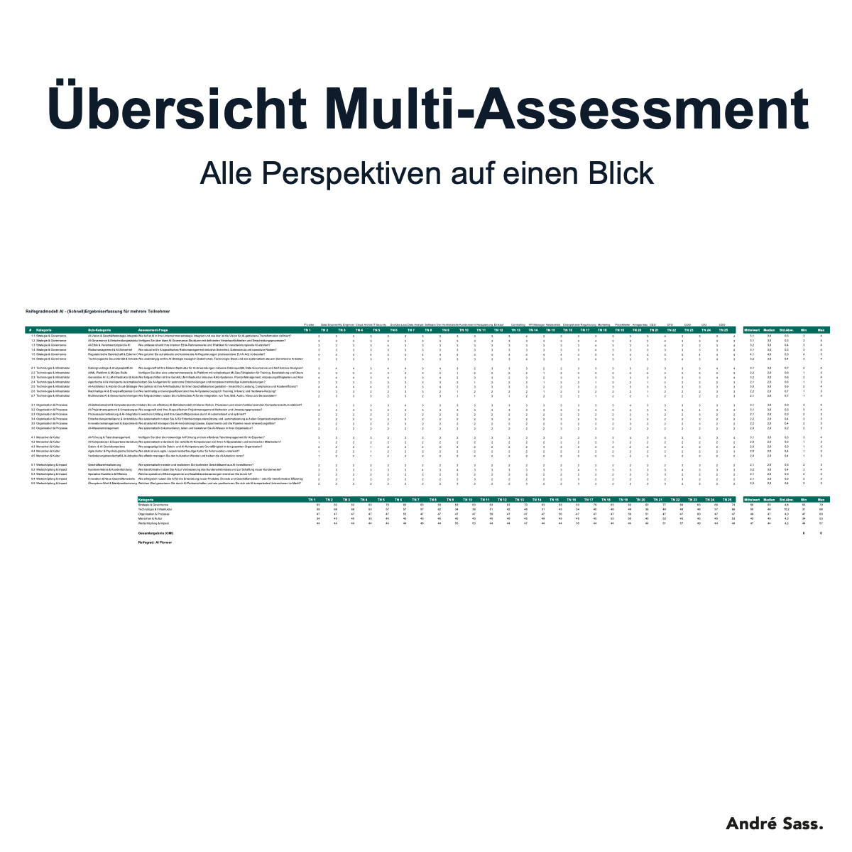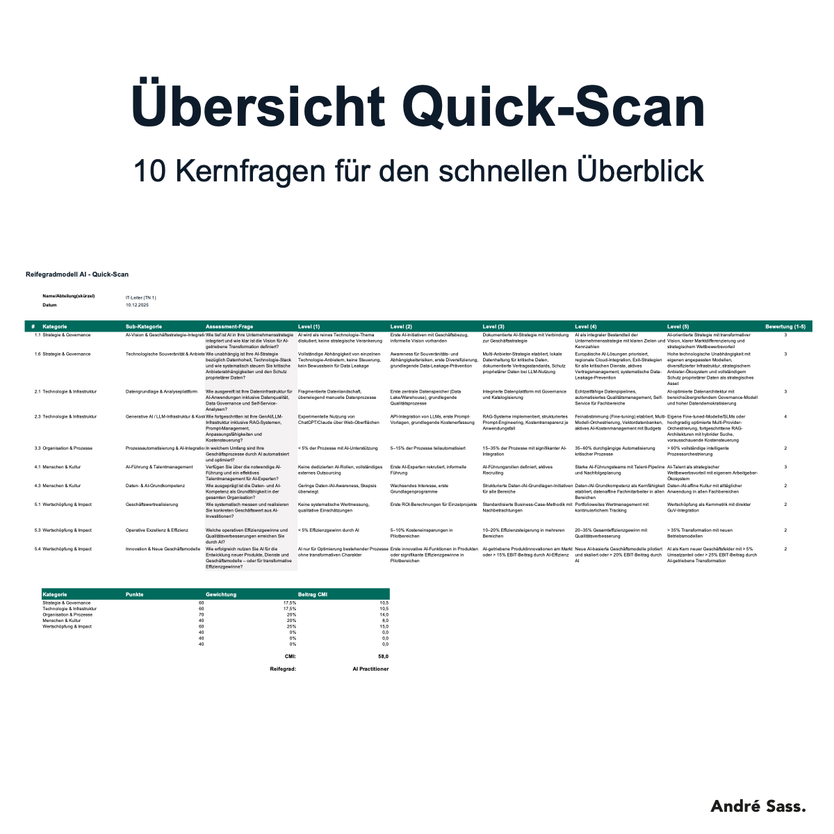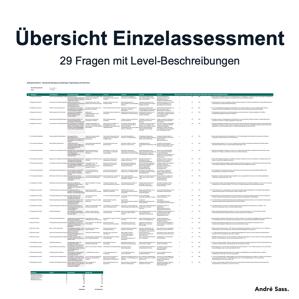 Dieses Assessment liefert Klarheit: Eine strukturierte, evidenzbasierte Standortbestimmung über 5 Dimensionen mit 29 Fragen. Es schließt die Lücke zwischen generischen Online-Tests und monatelangen Beratungsprojekten.