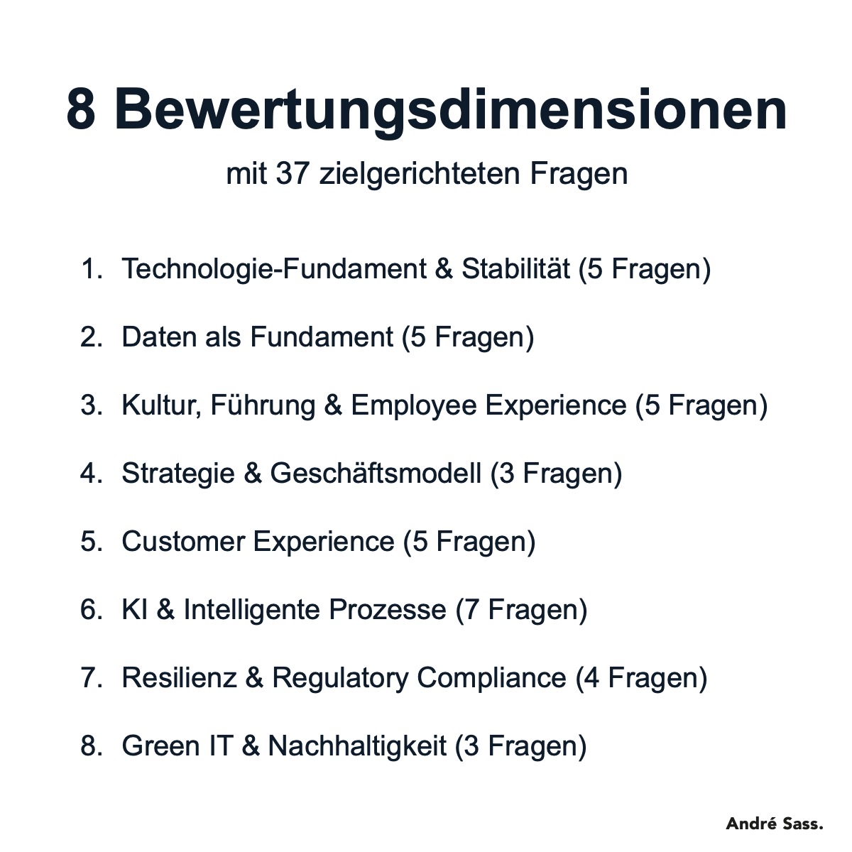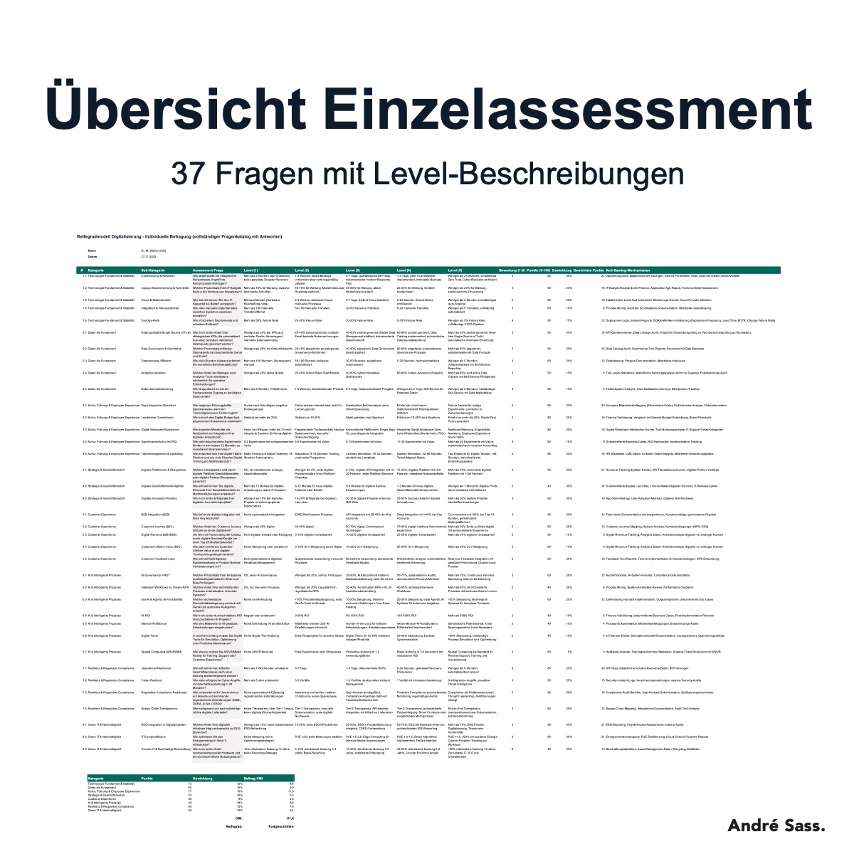 Strukturierte Standortbestimmung für Ihre digitale Transformation. 8 Dimensionen, 37 Assessment-Fragen, automatische Visualisierung. Mit Quick-Scan für den schnellen Überblick und Multi-Assessment für Führungsteams. Excel-Tool zum Sofort-Download.