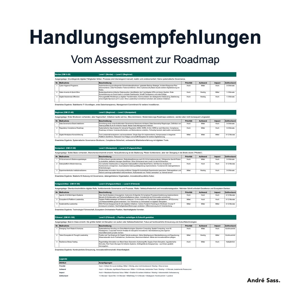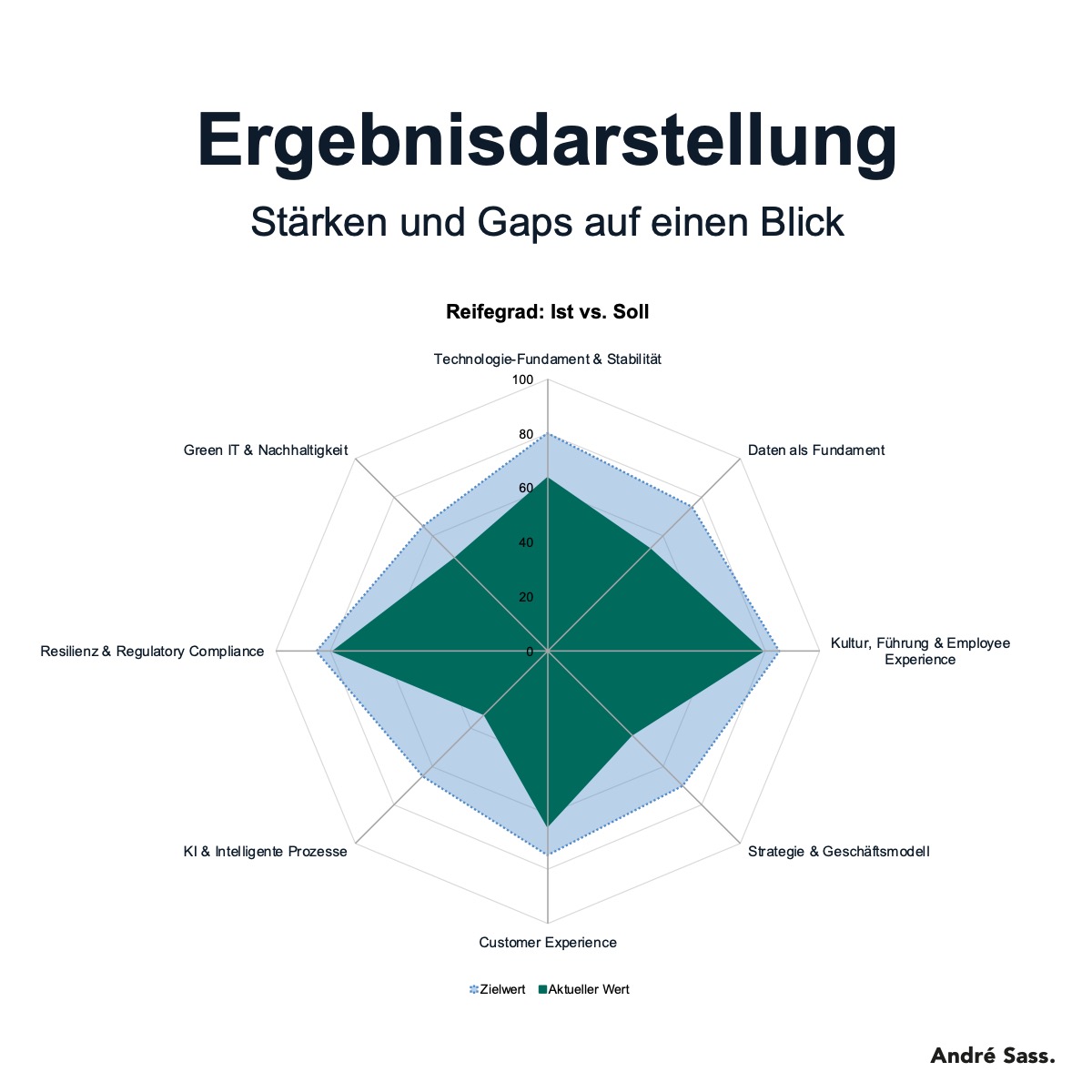 Dieses Assessment liefert Klarheit: Eine strukturierte, evidenzbasierte Standortbestimmung über 8 Dimensionen – von der Technologie-Basis bis zur KI-Governance.